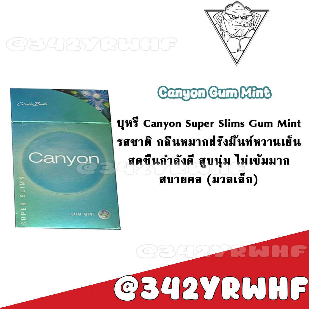 บุหรี่ Canyon Super Slims Gum Mint – หมากฝรั่งมิ้นท์ รสชาติ กลิ่นหมากฝรั่งมิ้นท์หวานเย็น สดชื่นกำลังดี สูบนุ่ม ไม่เข้มมาก สบายคอ
